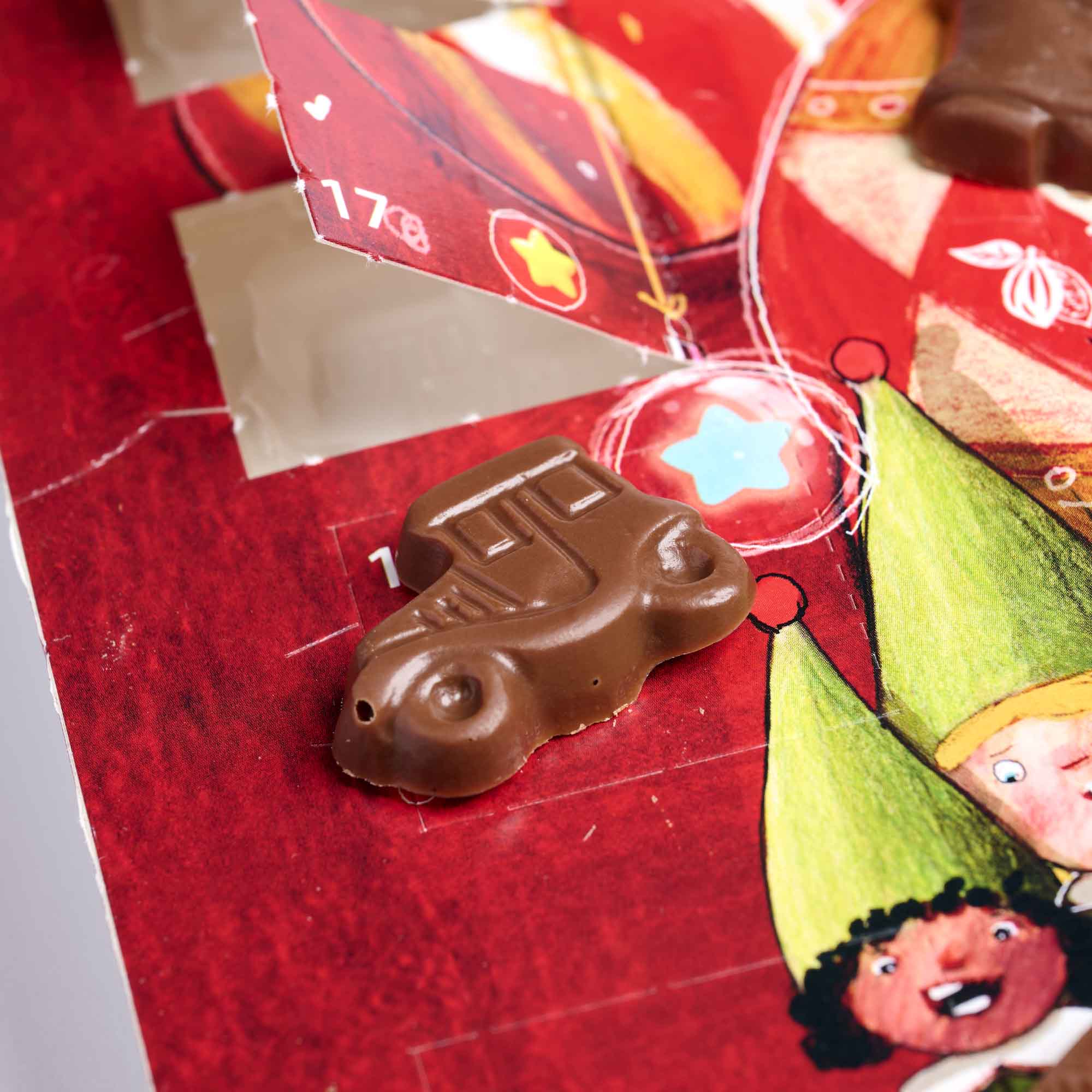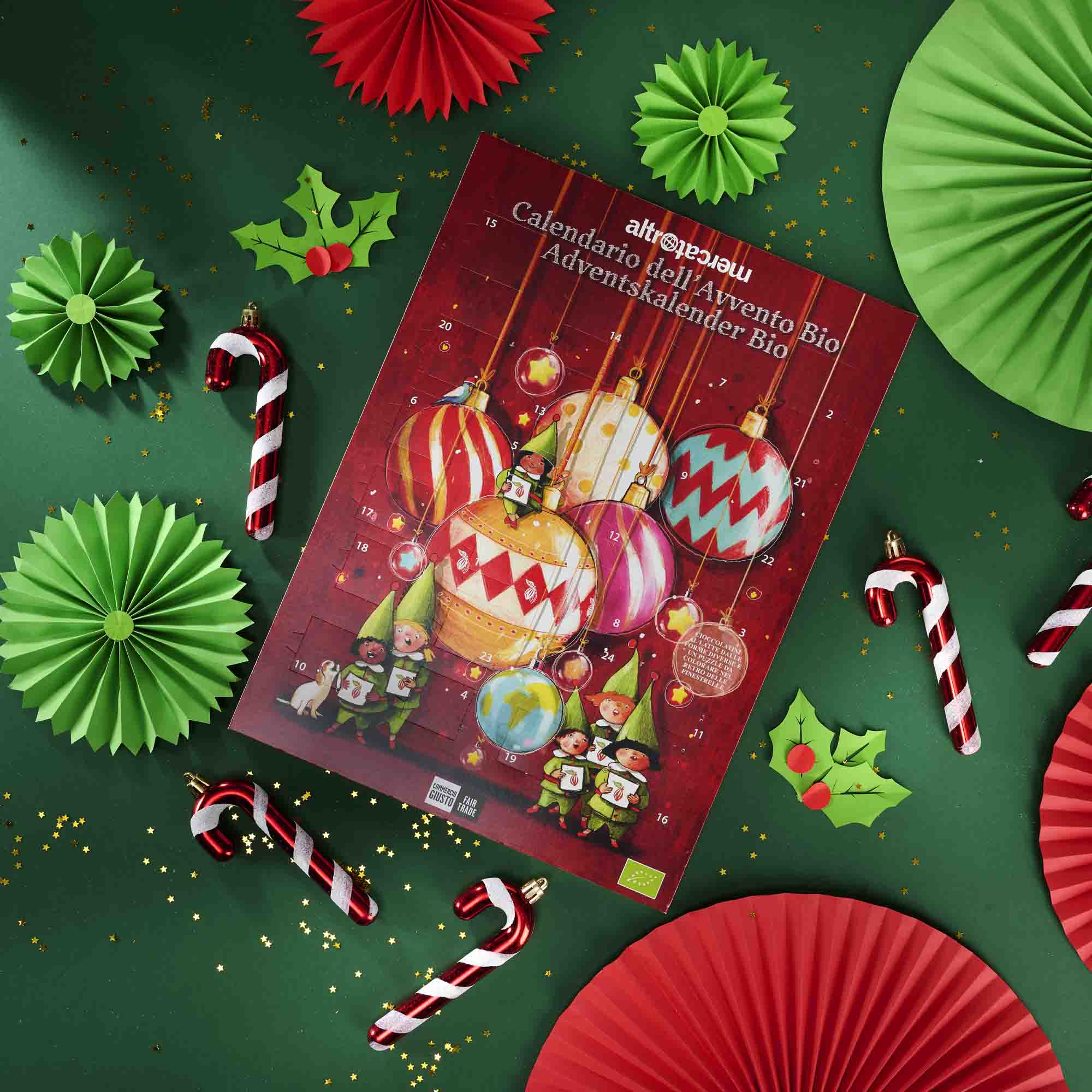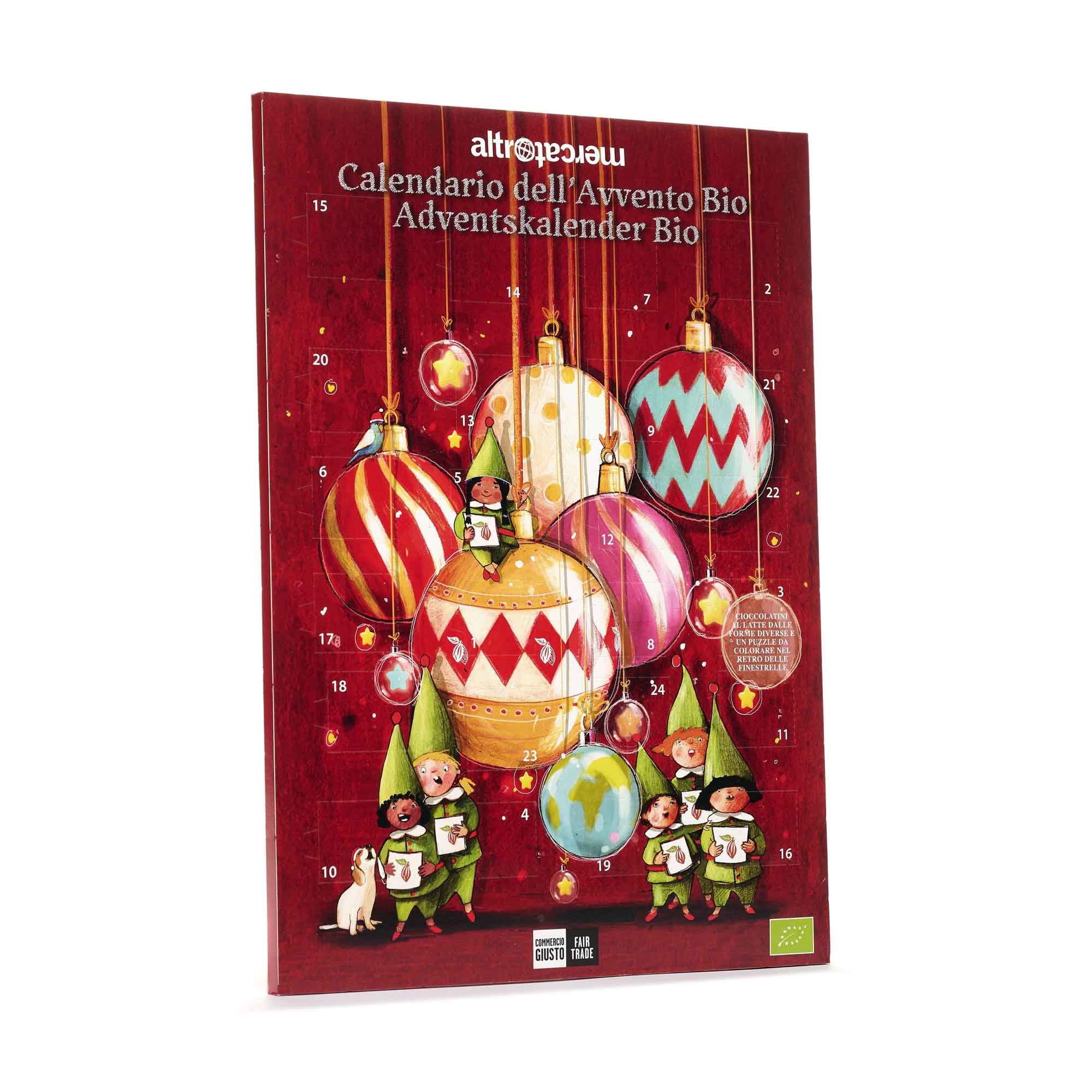 SPECIFICHE: Calendario dell'avvento bio - 24 cioccolatini al latte da Agricoltura biologica, posizionati all’interno di appositi alloggiamenti e confezionati in cartoncino alimentare finestrato con grafica natalizia. A base di ingredienti del Commercio Equo e Solidale. Da agricoltura biologica, conforme al regolamento CE 834/2007.